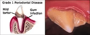 - Grade 1: The gums are red and inflamed from tartar and infection (gingivitis), but the infection has not yet spread to the tooth root and bony structures (periodontitis). The gums may be tender, but the tooth is not painful. The condition is completely reversible with a dental cleaning and home care.