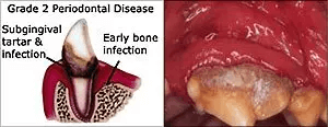 - Grade 2: The infection has spread from the gums to the deeper tissues and is starting to destroy the bone around the tooth. The gums are tender and there may be mild pain in the tooth. An odor may be noticeable. The condition is still reversible with regularly scheduled sub-gingival dental cleanings and home care.