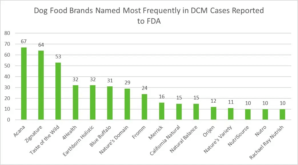 - Partial list of brands with reported cases include: Acana, Zignature, Taste of the Wild, 4Health, Earthborn Holistic, Blue Buffalo, Nature’s Domain, Fromm, Merrick, California Naturals, Natural Balance, Origen, Nature’s Variety, Nutrisource, Nutro, Rachel Ray Nutrish, Kirkland (Costco), Wellness Core, Nutriscience, Canidae, Solid Gold, Primal (Raw)